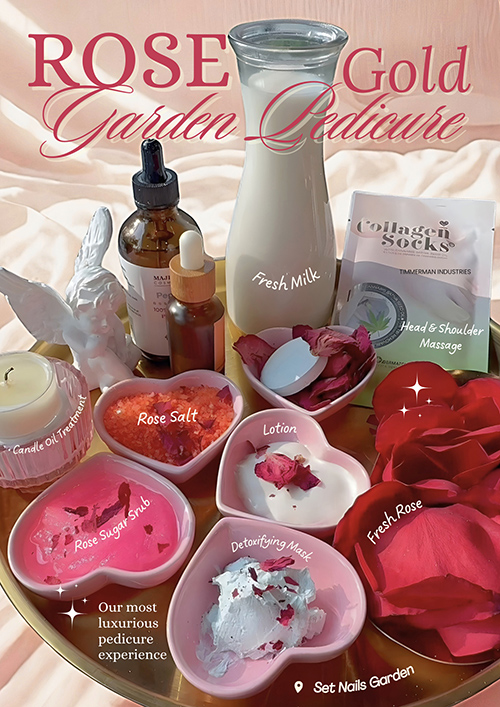 ● Begin with a sea salt soak and gentle callus treatment, followed by a garden-inspired sugar scrub and soothing lotion massage. Includes polish of your choice for a clean, polished look.